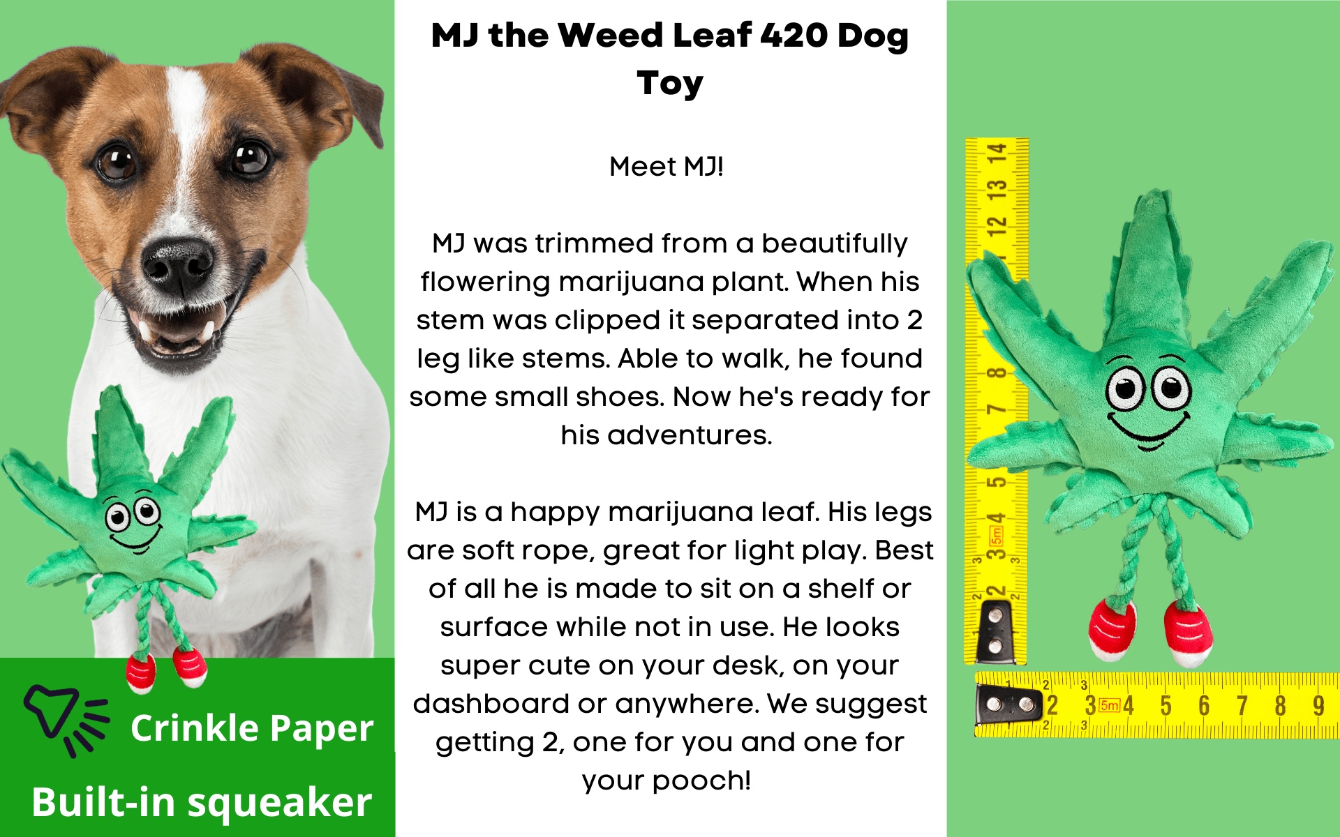 MJ is approximately 9" across and 13" from his top leaf to his shoes. He is a happy leaf filled with crinkle paper and a squeaker your dog will love. His legs are soft rope great for light play. Best of all he is made to sit on a shelf or surface while not in use. He looks super cute on your desk; dash or anywhere.